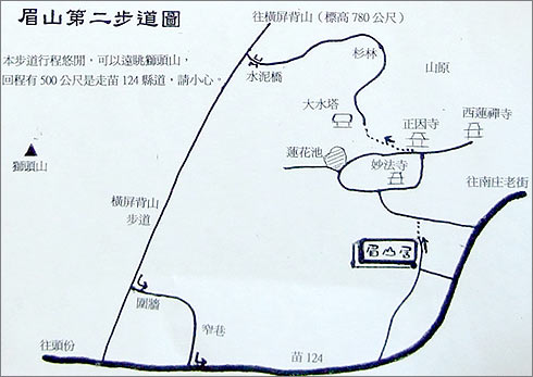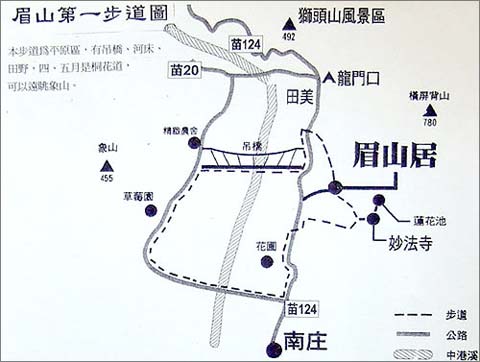 這是一條,以眉山居為中心的環狀徒步道路,長度約2.5公里,繞一圈,要50分鐘。在2004年7月9日,頻果日報的旅遊版,曾在「秘境探訪」的專欄中,以半版的篇幅報導。